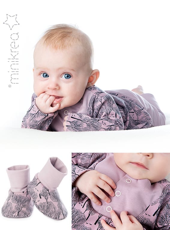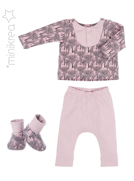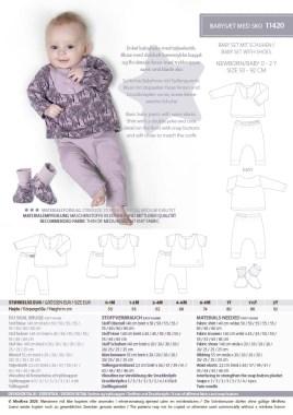Patron de couture pour un ensemble bébé de 0 à 2 ans, incluant un pantalon, un t-shirt manche longue et des chaussures coton.
